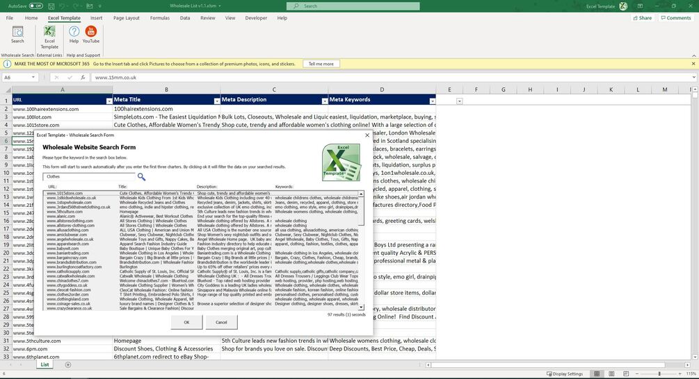 Built within the template is a customised search form that will search for a key word across all the meta tag fields. You can then automatically apply a filter using your search results. Or simply double click on a search result to load the web page. This is to help you find the best supplier for your new business venture.